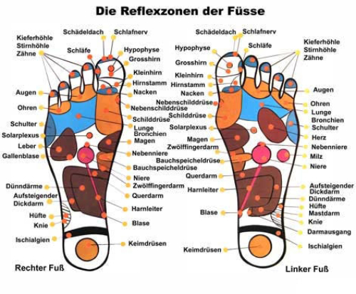Die Fußreflexzonenmassage begründet sich auf altes, überliefertes Wissen verschiedener Kulturen, welches zu einer harmonisierenden Therapie zuzsammengefasst wurde. Der menschliche Körper wird in zehn Zonen eingeteilt. So verlaufen jeweils rechts und links von der Wirbelsäule fünf Längszonen, die von zehn Bahnen bzw. Energieströmen gebildet werden. Diese Längszonen enden an den Füßen, so dass sich alle Organe dort, in verkleinerter Form, wiederfinden. Eine Reizung eines Hautareals kann demzufolge ein auf der gleichen Zone befindliches Organ beeinflussen.